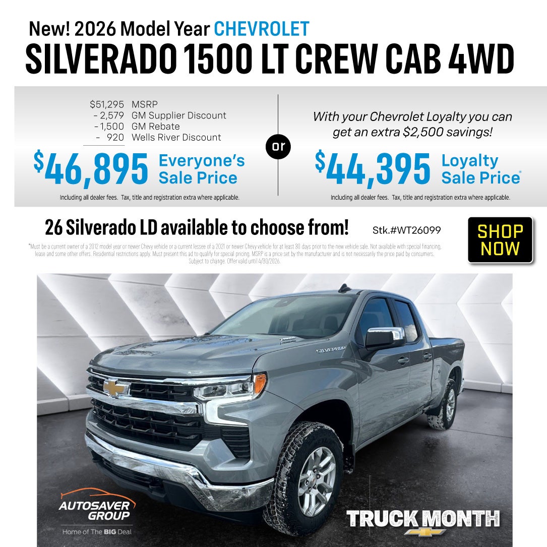 *Must be a current owner of a 2012 model year or newer Chevy vehicle or a current lessee of a 2021 or newer Chevy vehicle for at least 30 days prior to the new vehicle sale. Not available with special financing, lease and some other offers. Residential restrictions apply. Must present this ad to qualify for special pricing. MSRP is a price set by the manufacturer and is not necessarily the price paid by consumers. Subject to change. Offer valid until 4/30/2026.