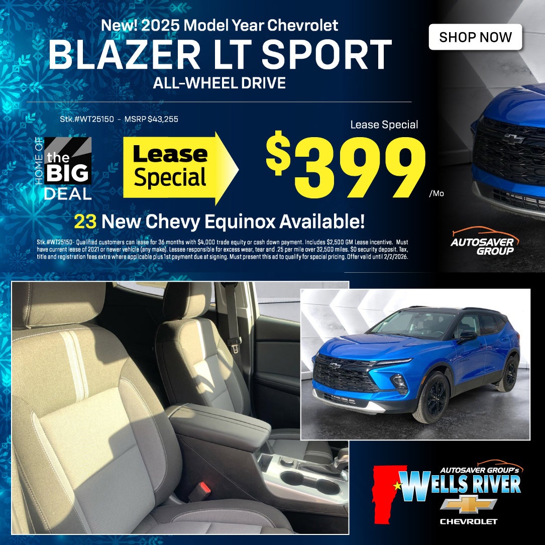 Qualified customers can lease for 36 months with $4,000 trade equity or cash down payment. Includes $2,500 GM Lease incentive. Must have current lease of 2021 or newer vehicle (any make). Lessee responsible for excess wear, tear and .25 per mile over 32,500 miles. $0 security deposit. Tax, title and registration fees extra where applicable plus 1st payment due at signing. Must present this ad to qualify for special pricing. Offer valid until 2/2/2026.