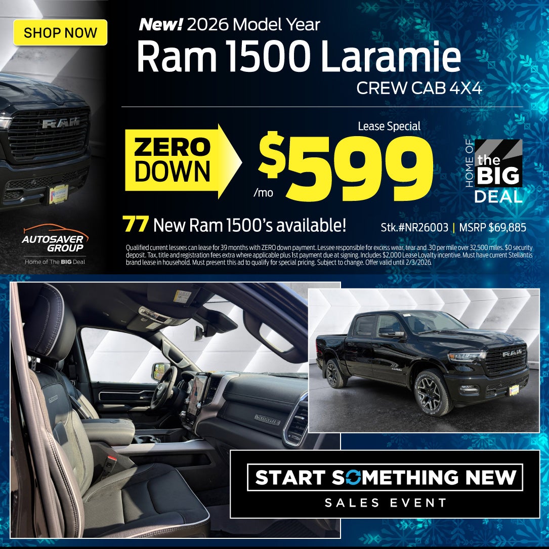 Qualified current lessees can lease for 39 months with ZERO down payment. Lessee responsible for excess wear, tear and .30 per mile over 32,500 miles. $0 security deposit. Tax, title and registration fees extra where applicable plus 1st payment due at signing. Includes $2,000 Lease Loyalty incentive. Must have current Stellantis brand lease in household. Must present this ad to qualify for special pricing. Subject to change. Offer valid until 2/3/2026.